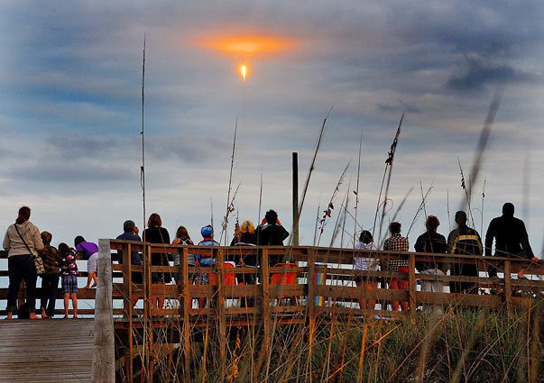 Florida 01/06/2014.- A SpaceX Falcon 9 Rocket with a commercial satellite aboard lights up the sky during a successful launch from the Cape Canaveral Air Force Station as people line the boardwalk, along the seashore in Cape Canaveral.